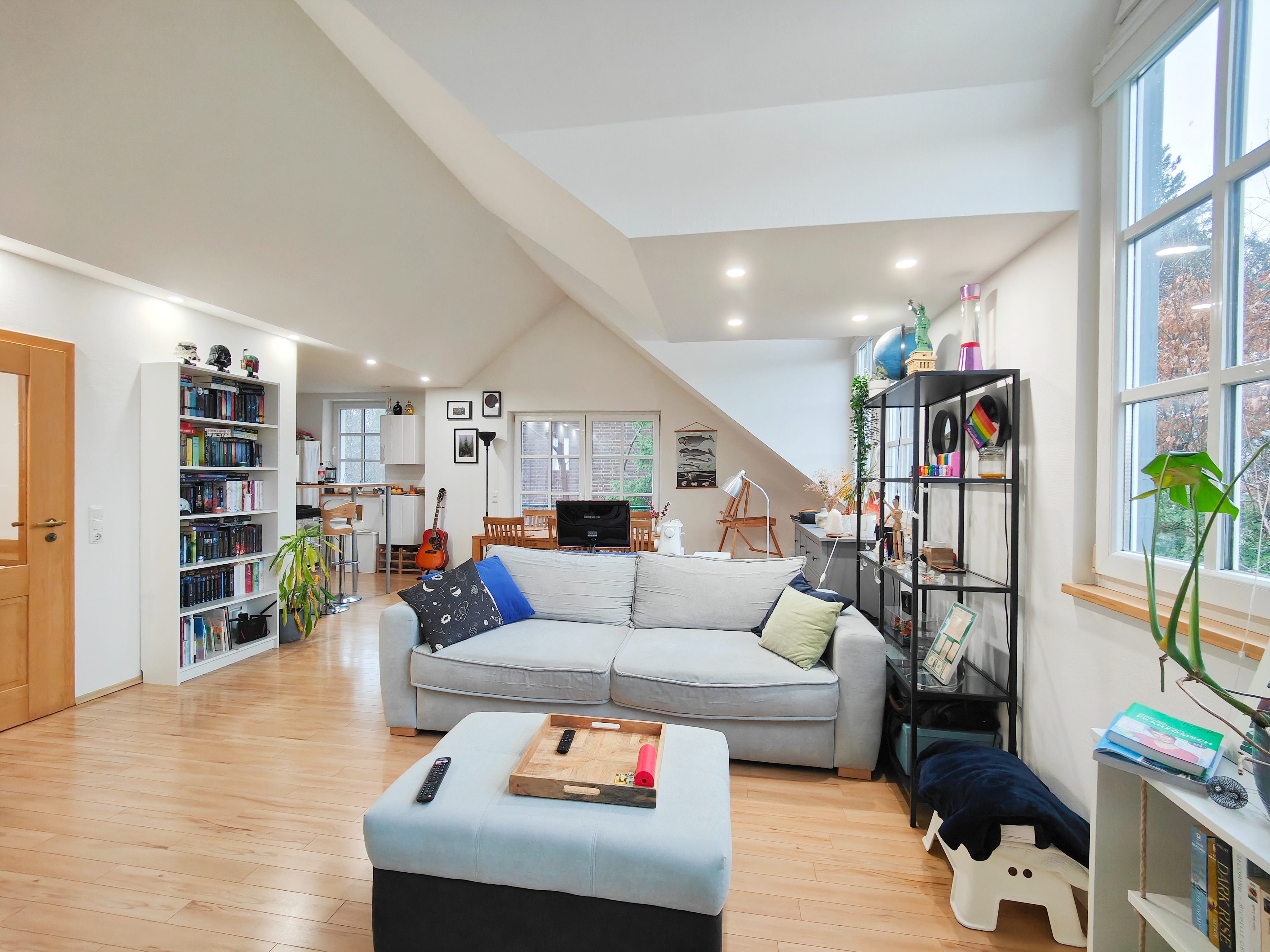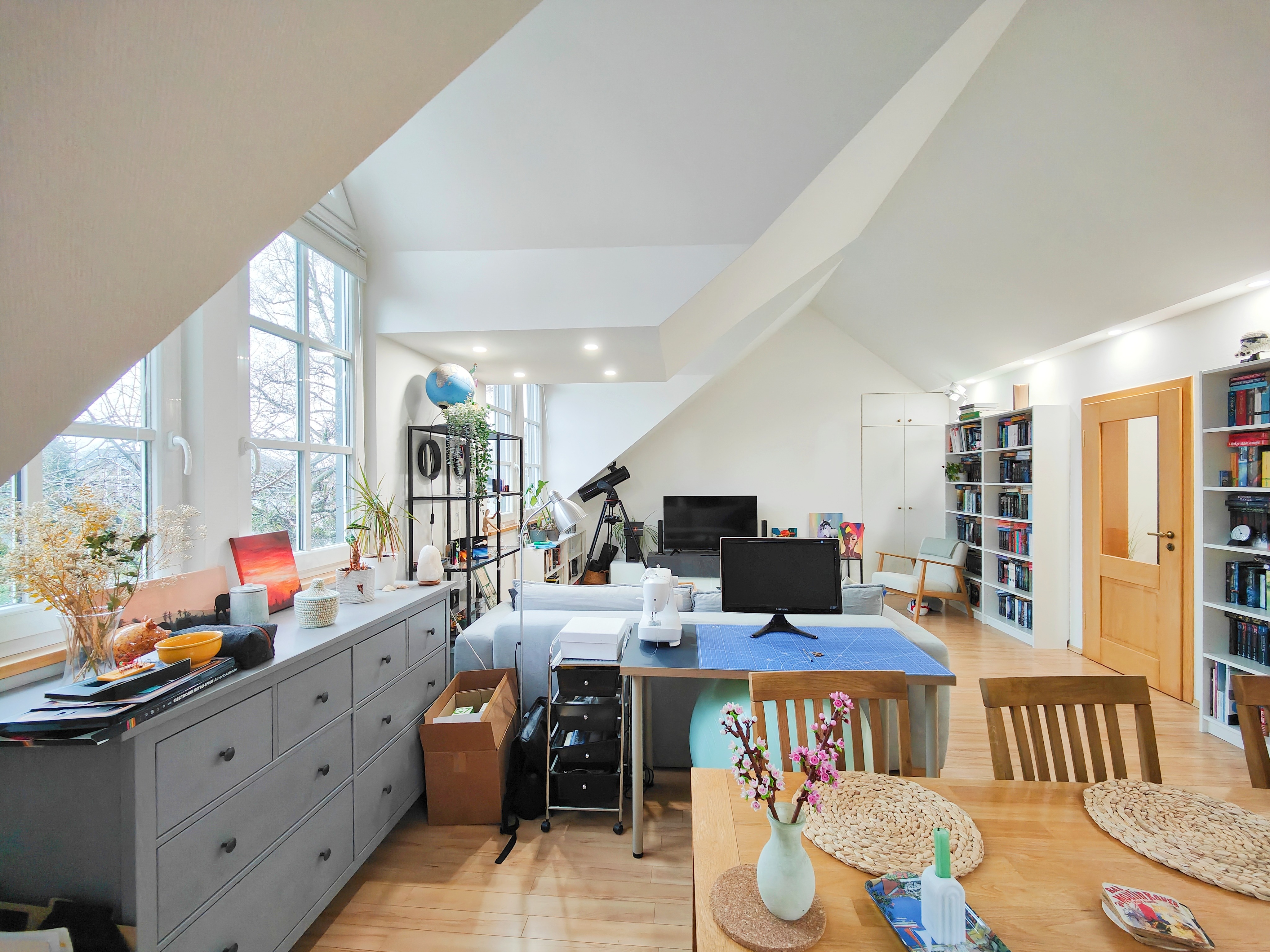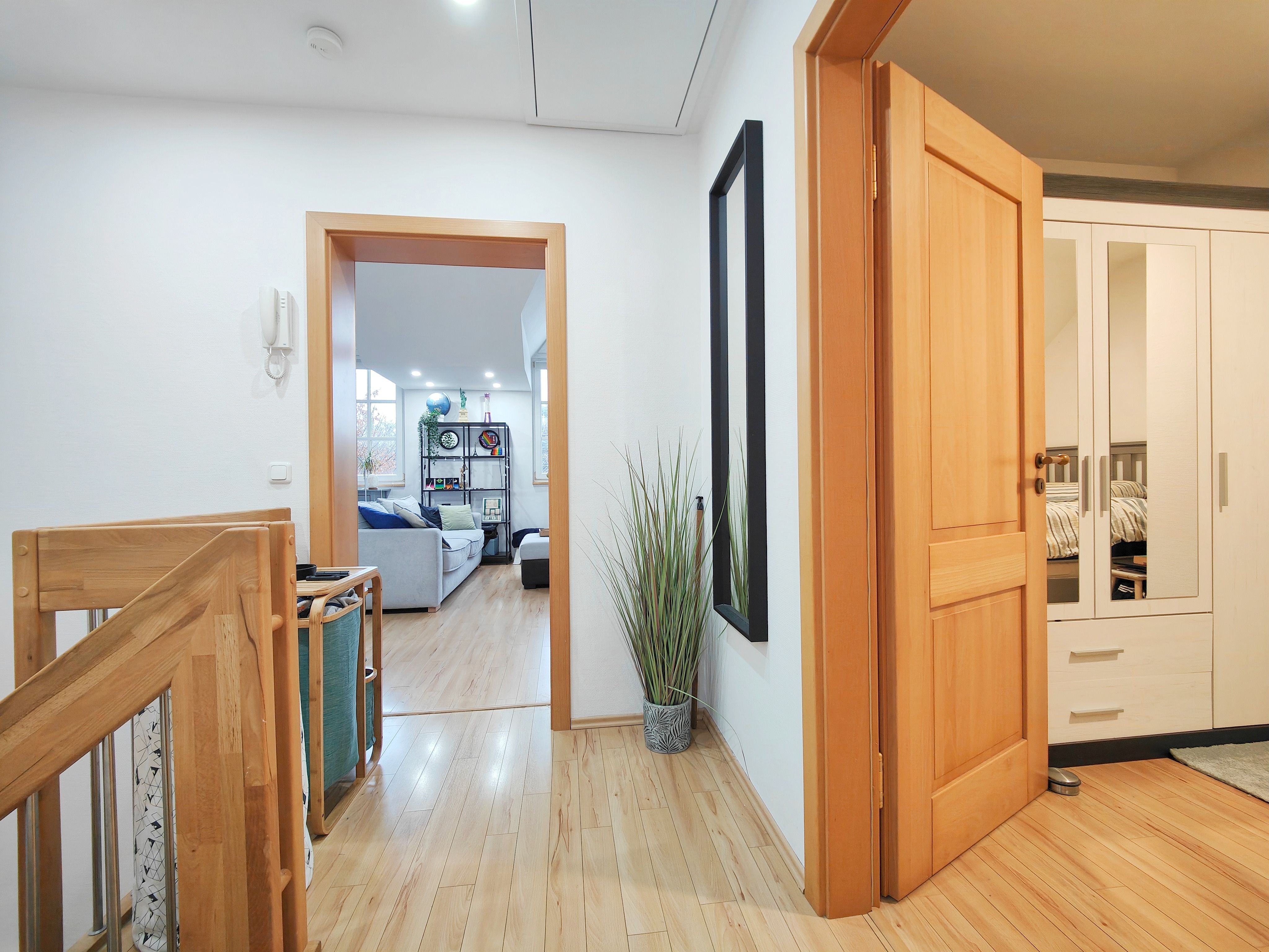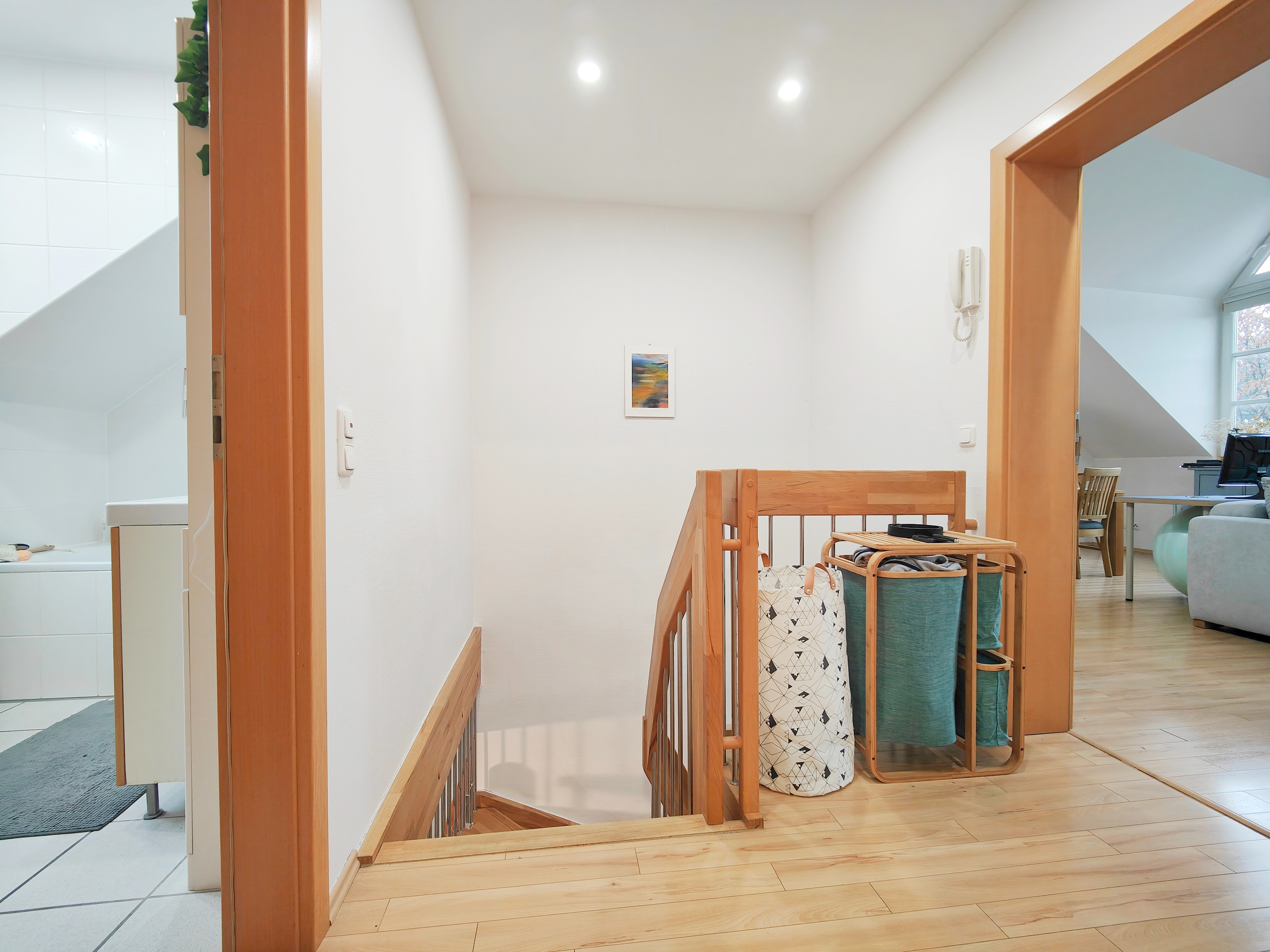 Von der Massivholztreppe aus gelangt man in den Flur des Dachgeschosses und hat Zugang zum Badezimmer mit Wanne und Fenster, zum Schlafzimmer und zum großzügigen und lichtdurchfluteten Wohnbereich mit offener Küche. Vom Wohnzimmer aus hat man Zugang zum Balkon. Im gesamten Obergeschoss ist Fußbodenheizung verlegt.