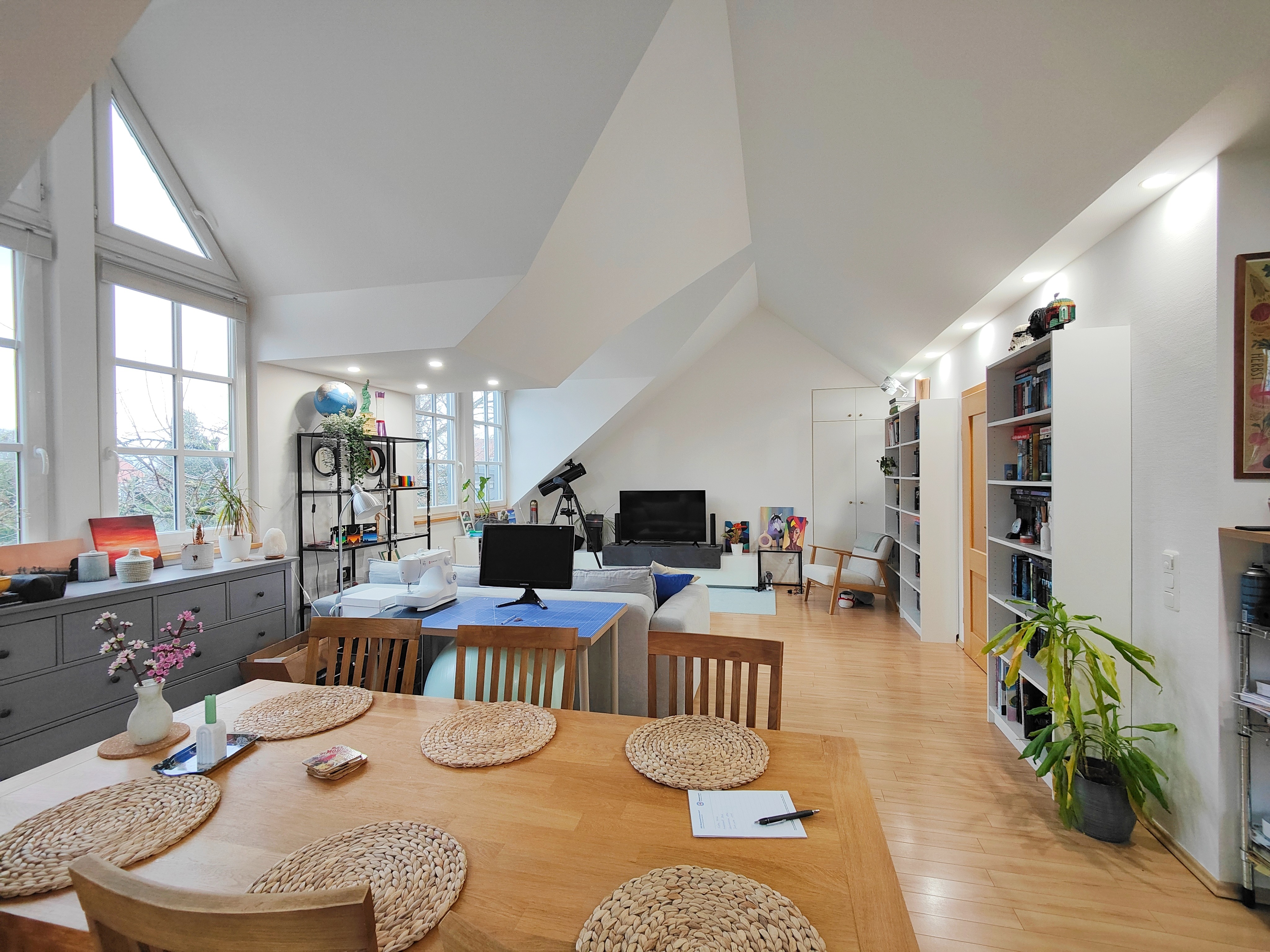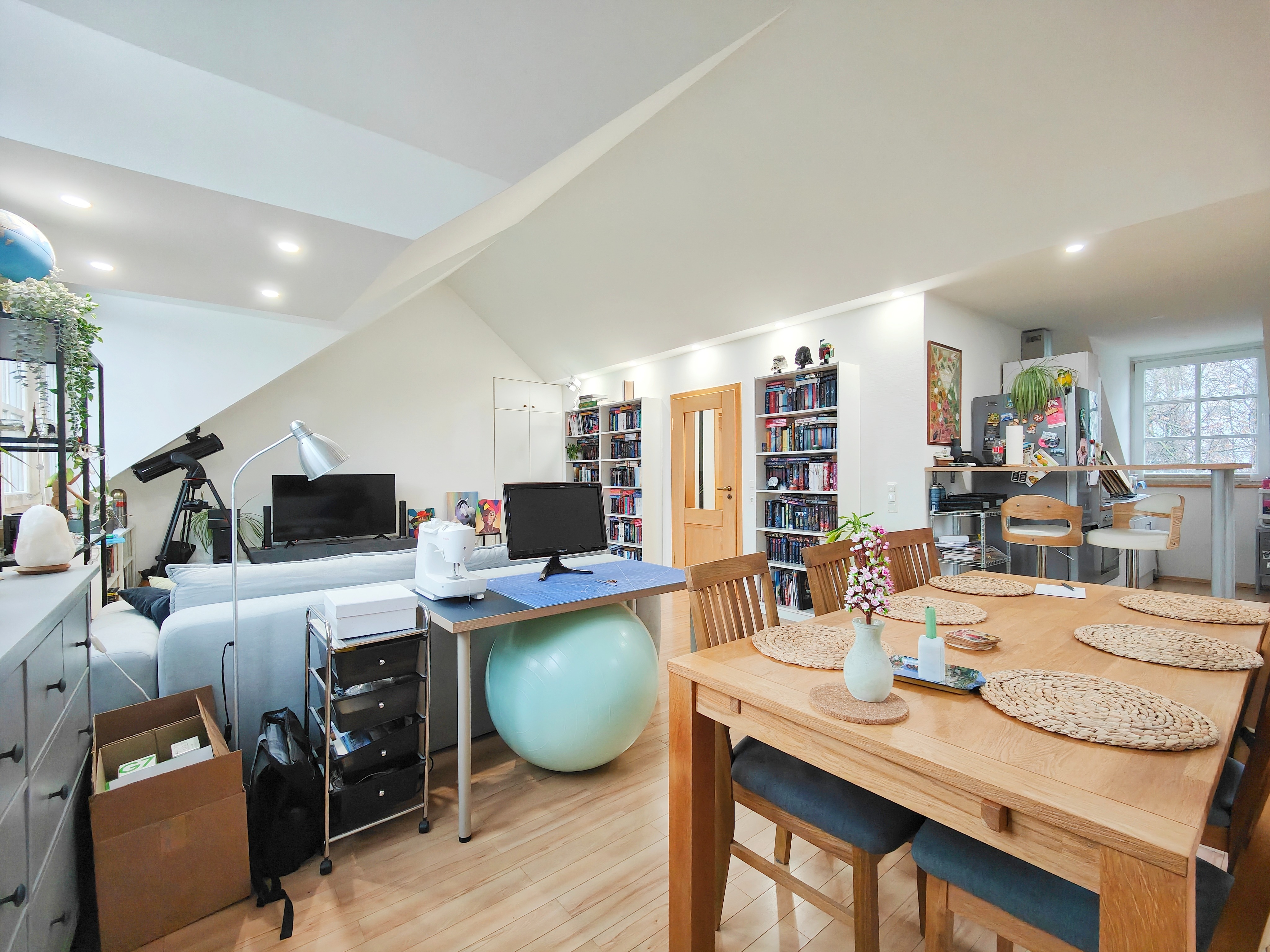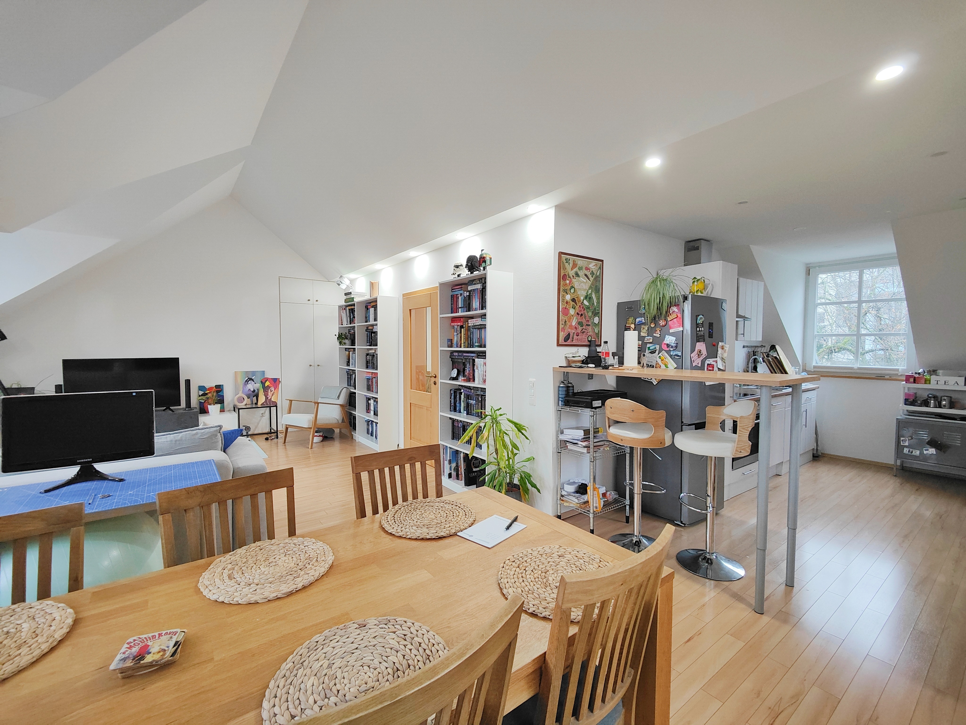 Von der Massivholztreppe aus gelangt man in den Flur des Dachgeschosses und hat Zugang zum Badezimmer mit Wanne und Fenster, zum Schlafzimmer und zum großzügigen und lichtdurchfluteten Wohnbereich mit offener Küche. Vom Wohnzimmer aus hat man Zugang zum Balkon. Im gesamten Obergeschoss ist Fußbodenheizung verlegt.