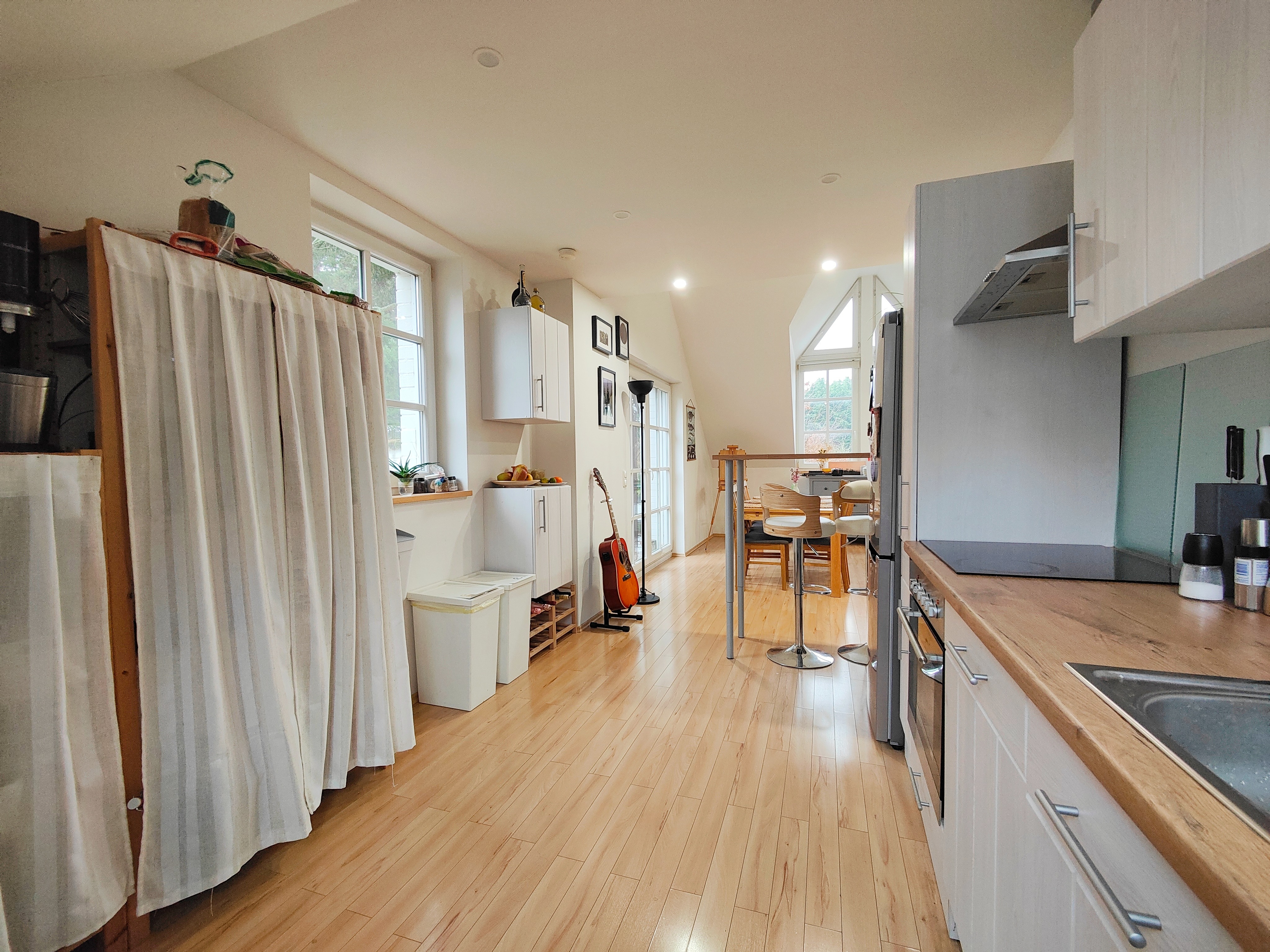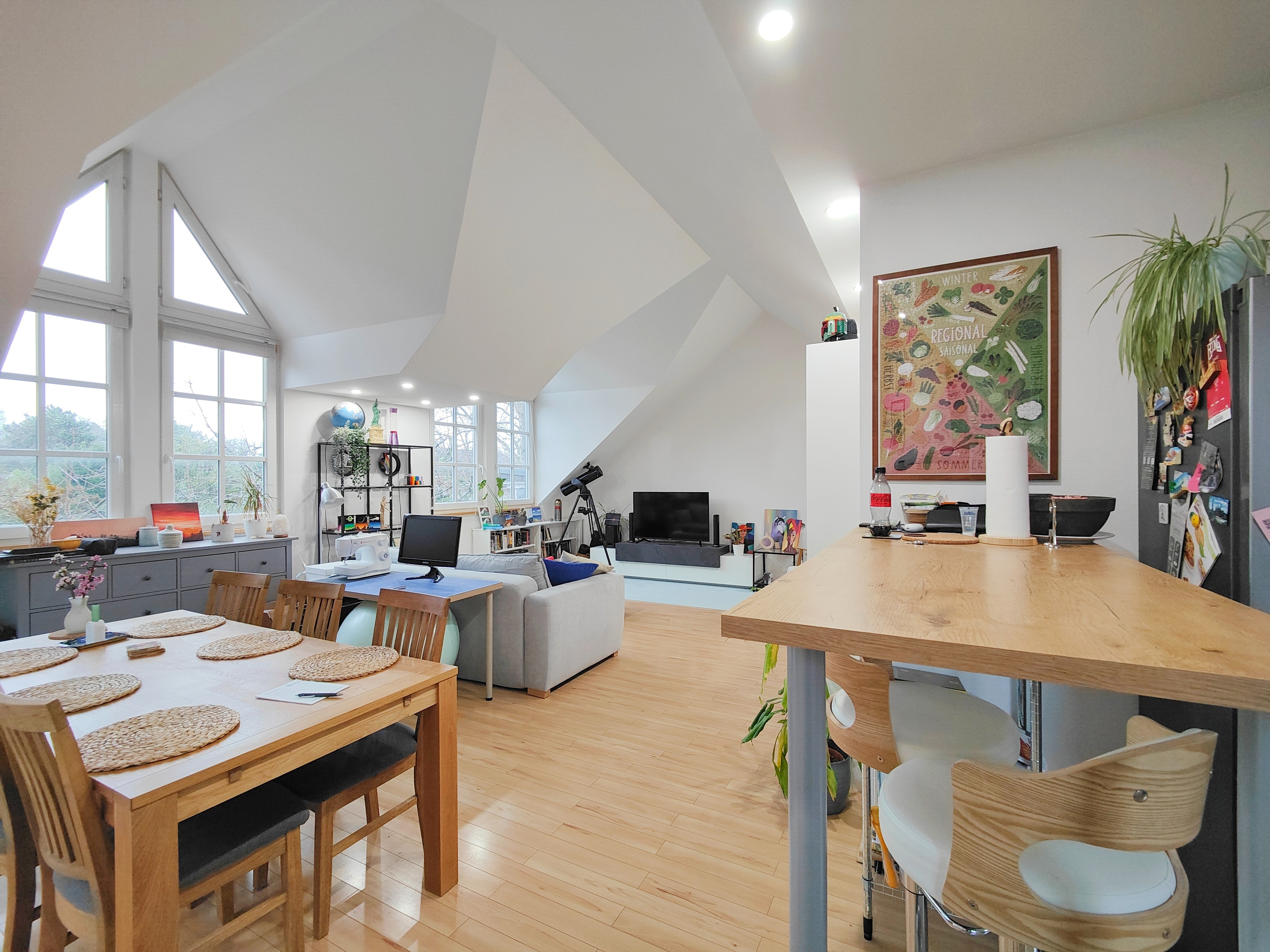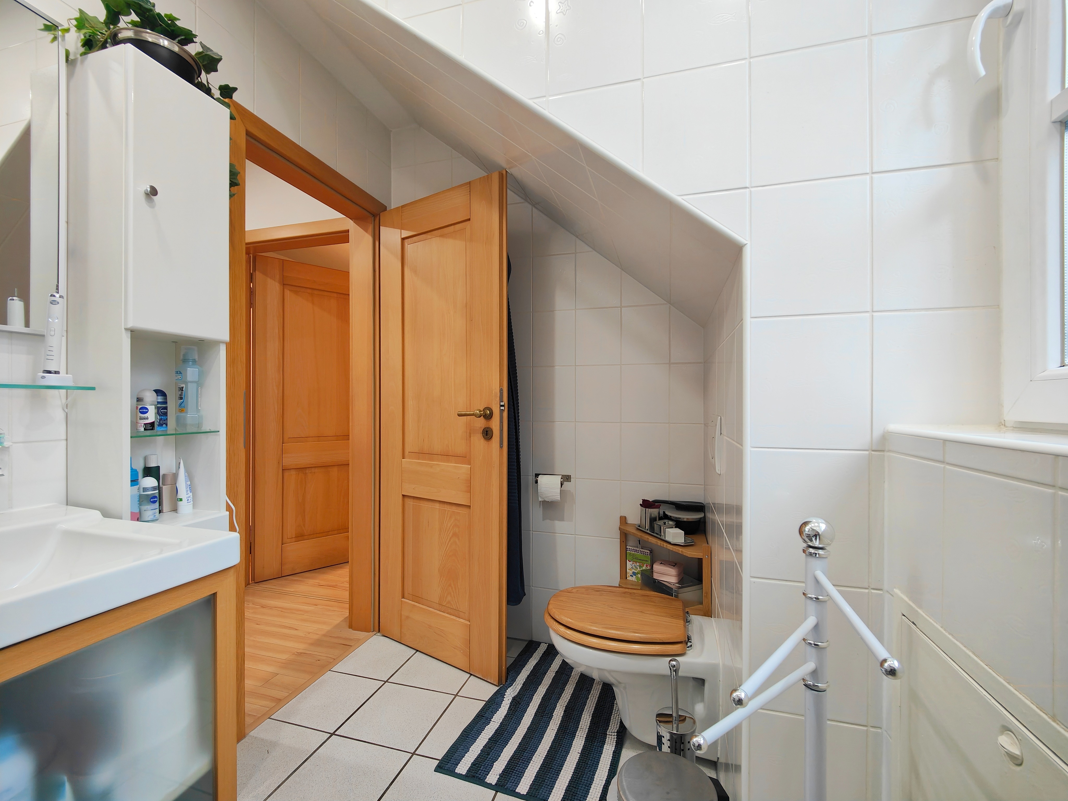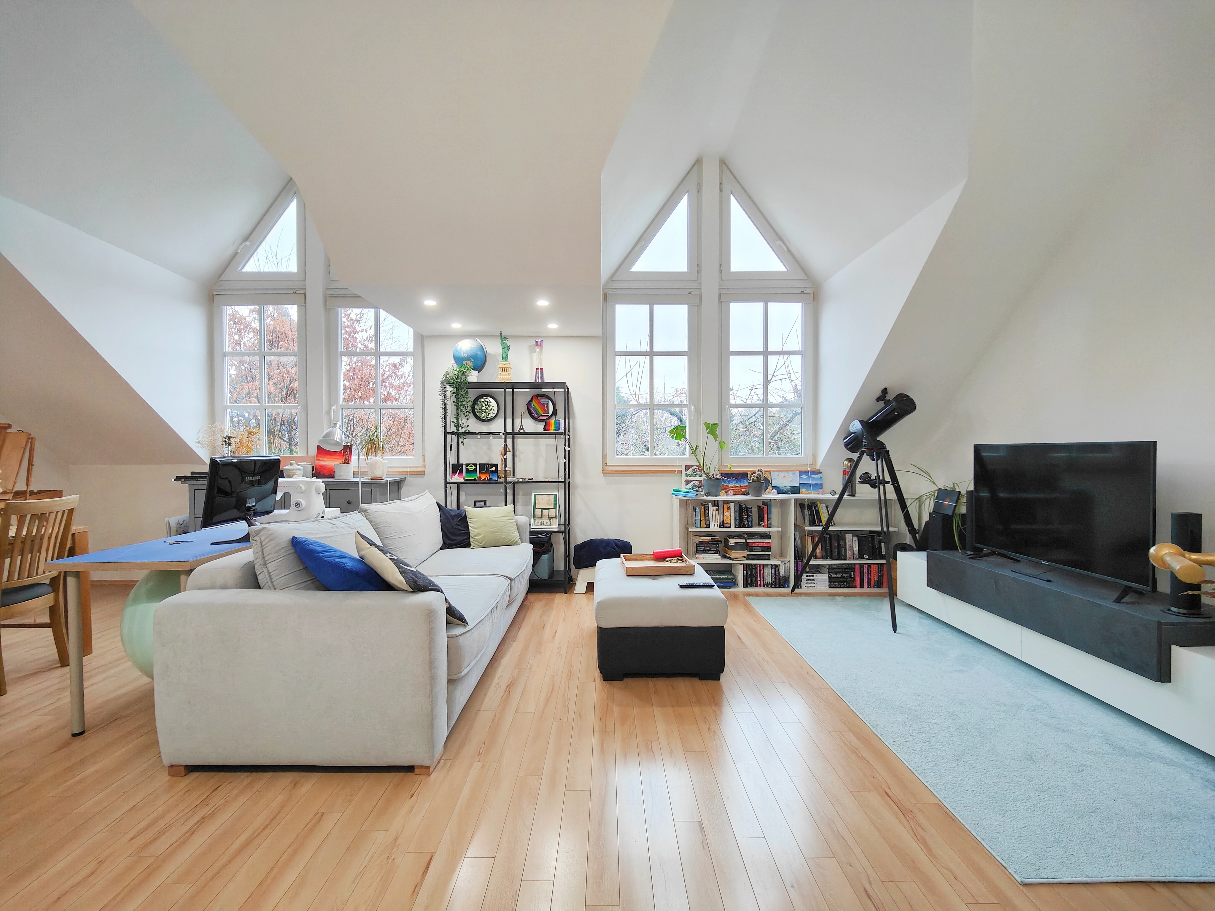 Von der Massivholztreppe aus gelangt man in den Flur des Dachgeschosses und hat Zugang zum Badezimmer mit Wanne und Fenster, zum Schlafzimmer und zum großzügigen und lichtdurchfluteten Wohnbereich mit offener Küche. Vom Wohnzimmer aus hat man Zugang zum Balkon. Im gesamten Obergeschoss ist Fußbodenheizung verlegt.