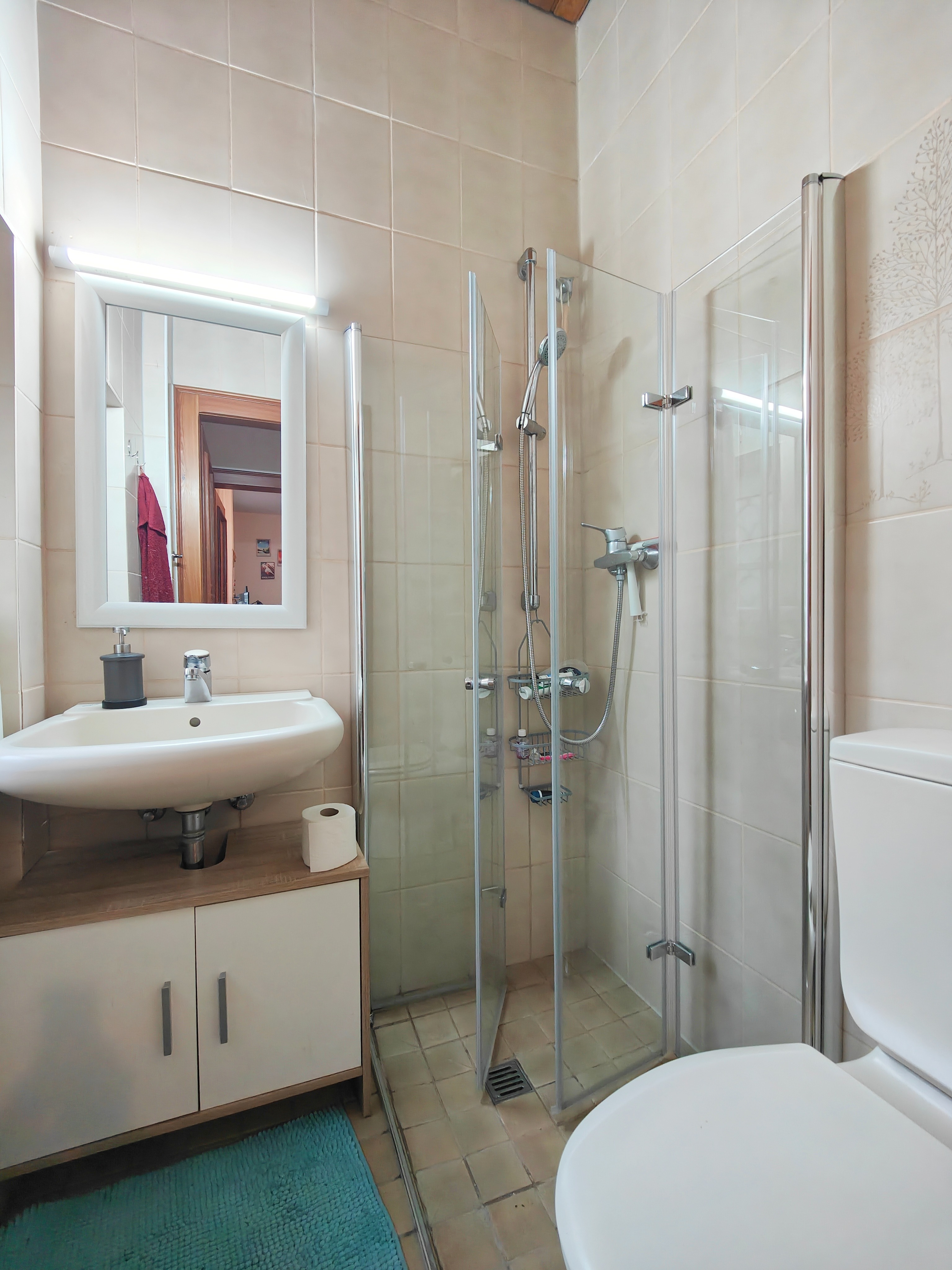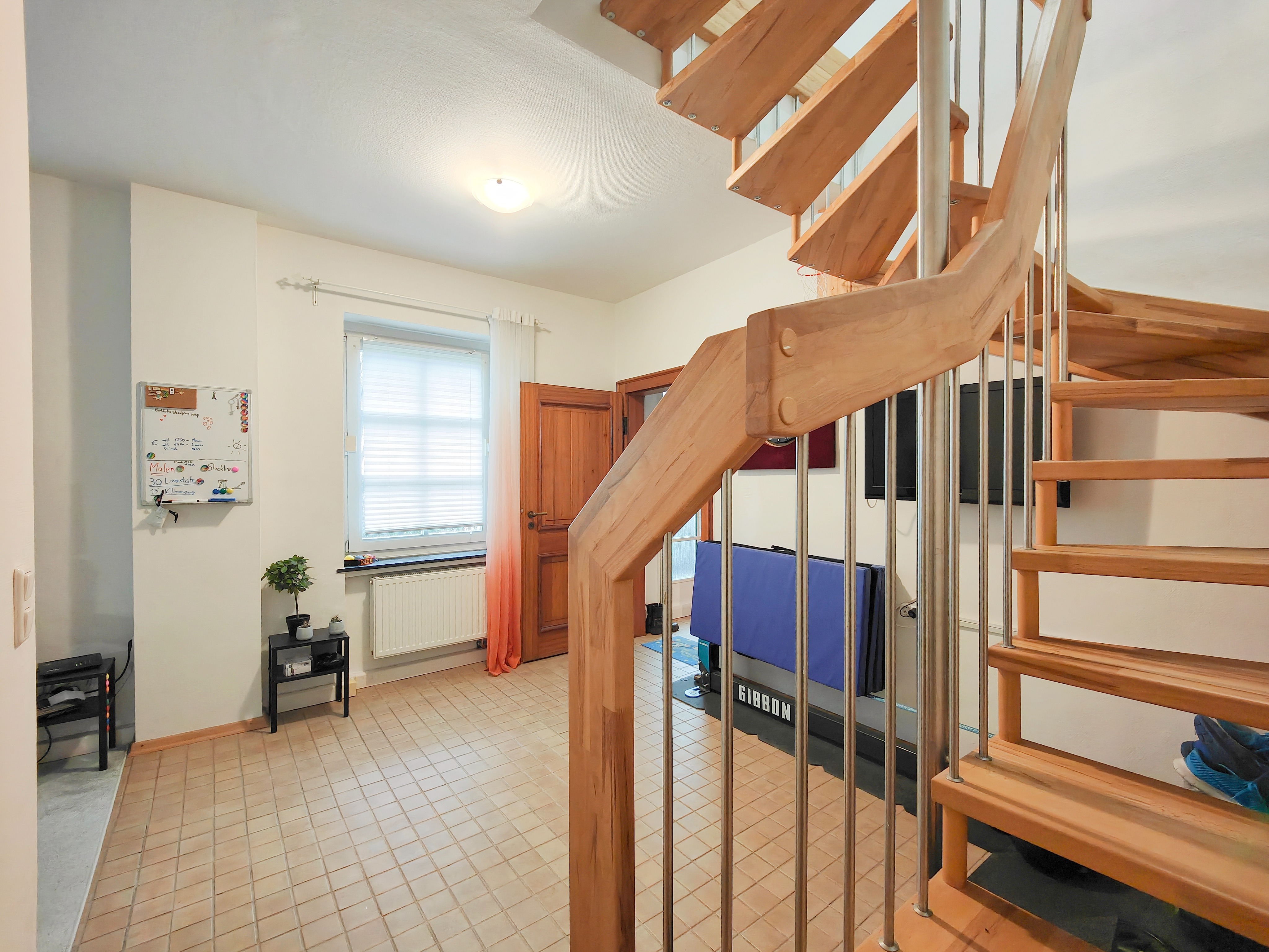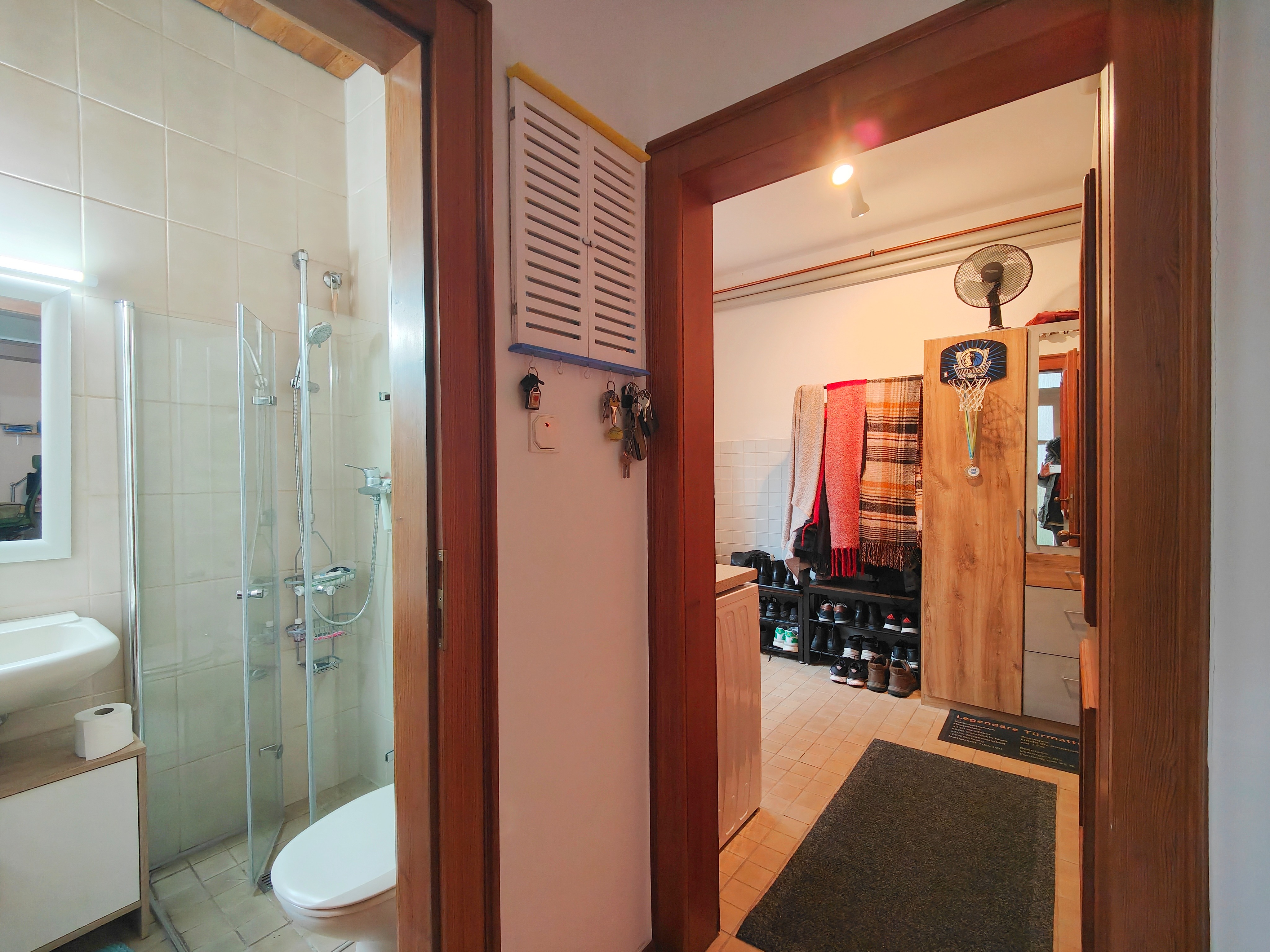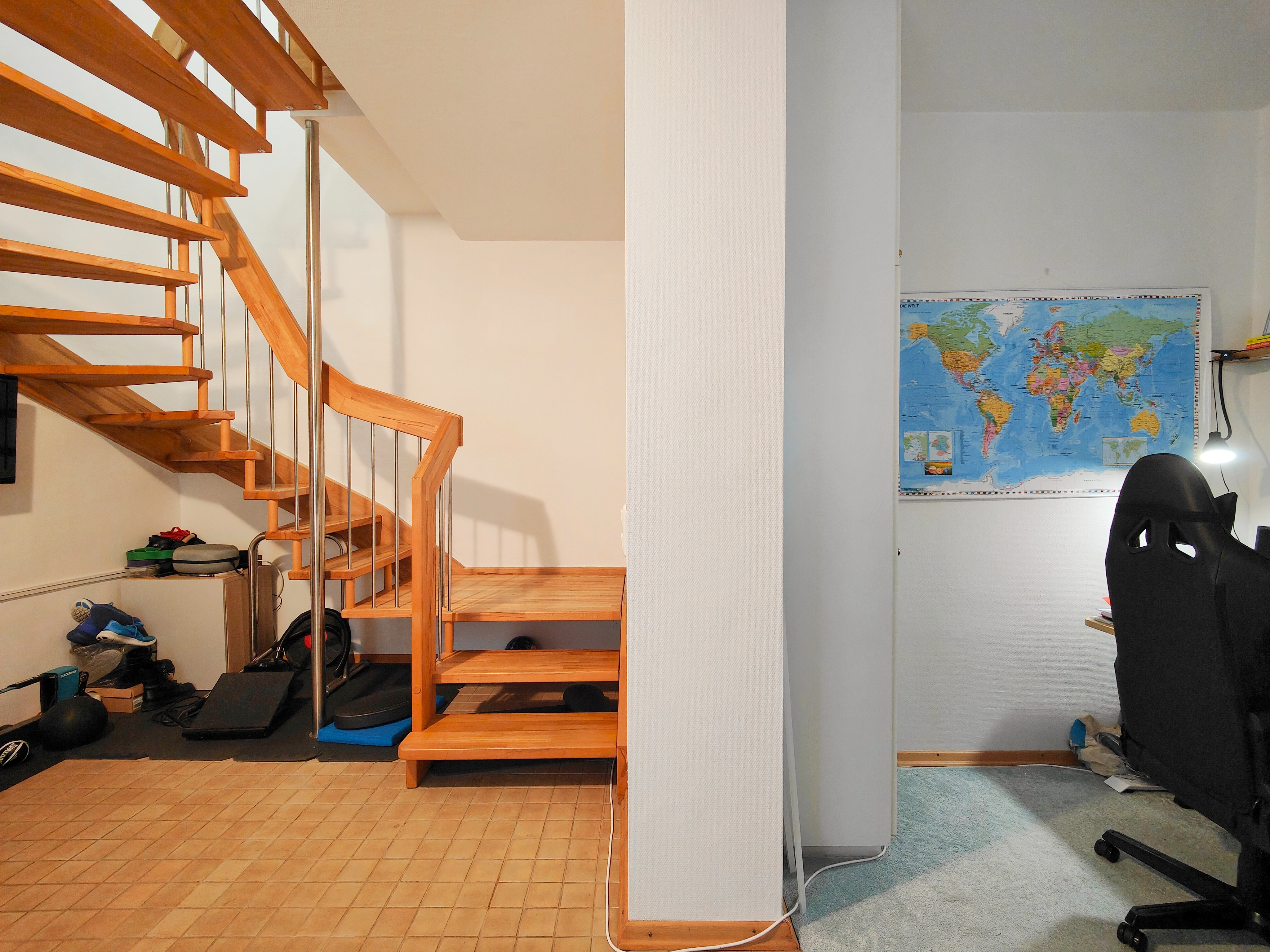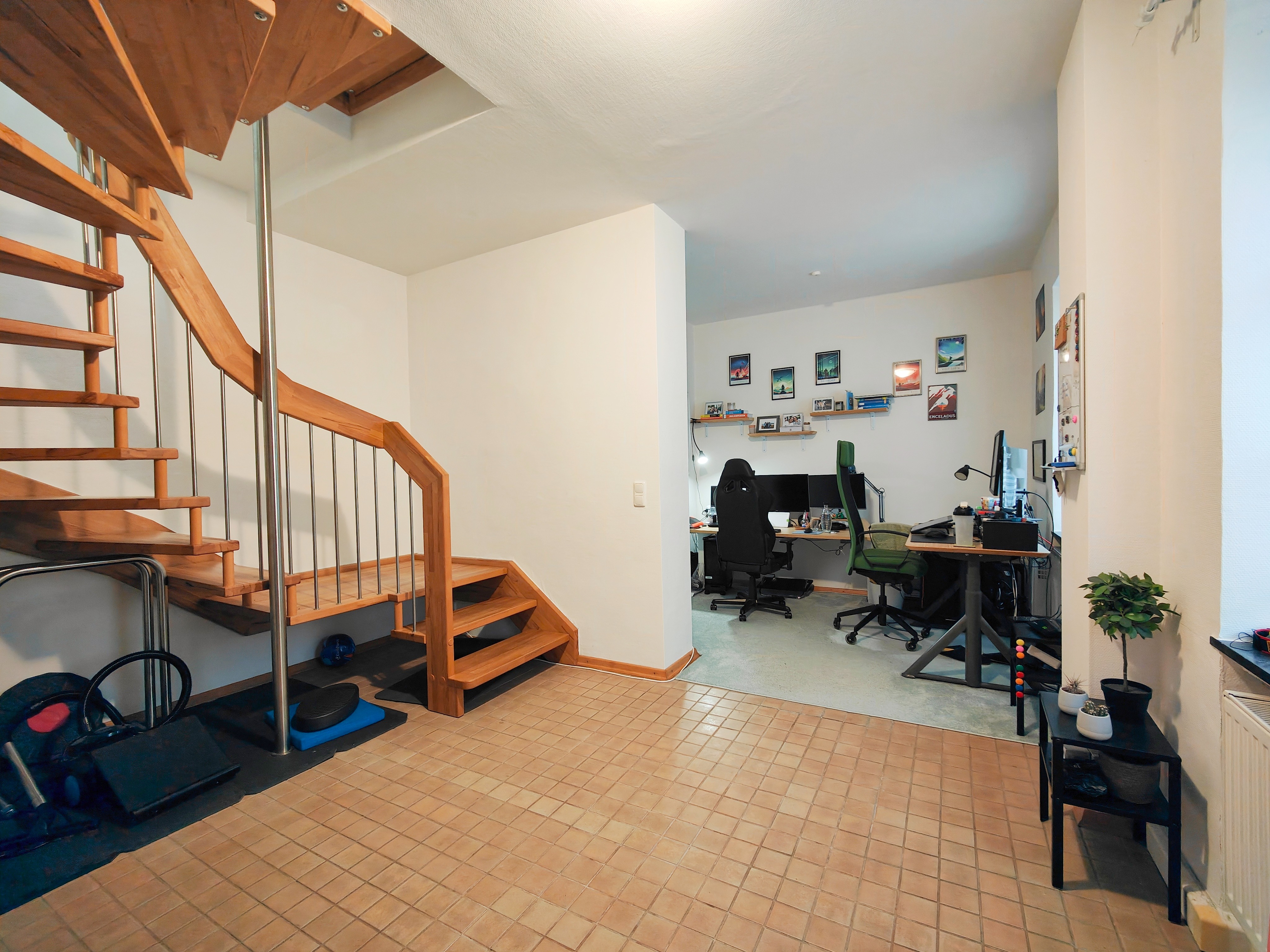 Die Wohnung besitzt einen eigenen Hauseingang mit eigener, schön angelegter Terrasse vor der Haustür, die durch einen Zaun mit Eingangstor eingefriedet ist und zur alleinigen Nutzung zur Verfügung steht. Von der Eingangstür im Erdgeschoss gelangt man in einen kleinen Flur mit Zugang zum Gäste-WC mit Dusche, zum großen Hauswirtschaftsraum/Abstellraum und zum offenen Arbeitsbereich mit Treppenaufgang.